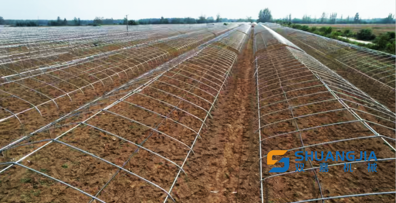 日前,湖北孝昌县白沙镇三合村1200余亩田地上,羊肚菌种植基地大棚搭建工程如火如荼地进行着。自10月以来,该基地全面铺开羊肚菌大棚搭建工作,2000余个钢架结构将陆续建成。